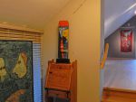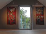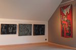 Un jardin rempli de créatures, de sculptures gigantesques, un souterrain couvert de mosaïques … comme un rêve d’enfant. Une maison peuplée de personnages peints sur les murs, de la cuisine au grenier, en passant par la chambre bleue, la chambre africaine, la chambre verte, la bibliothèque … Toiles, bois déchiquetés, vieilles cartes postales, bois flottés, mosaïques, racines, encres, métal récupéré, … Sous les bonnets rouges, des yeux verts nous observent. La magie de l’univers de Florence Marie s’offre à nous !