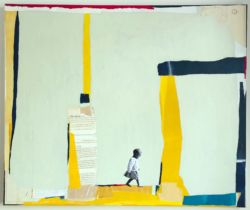 Dans certains collages, il y a parfois un petit personnage central. Il s’agit d’une fillette qu’elle a croisée en 2016 à Tananarive, la capitale de Madagascar. Elle devait avoir 3 ans. Elle rejoignait son petit frère qui jouait avec des cailloux sur le trottoir. Ils étaient plein d’innocence, n’avaient rien, jouant simplement dans la rue.